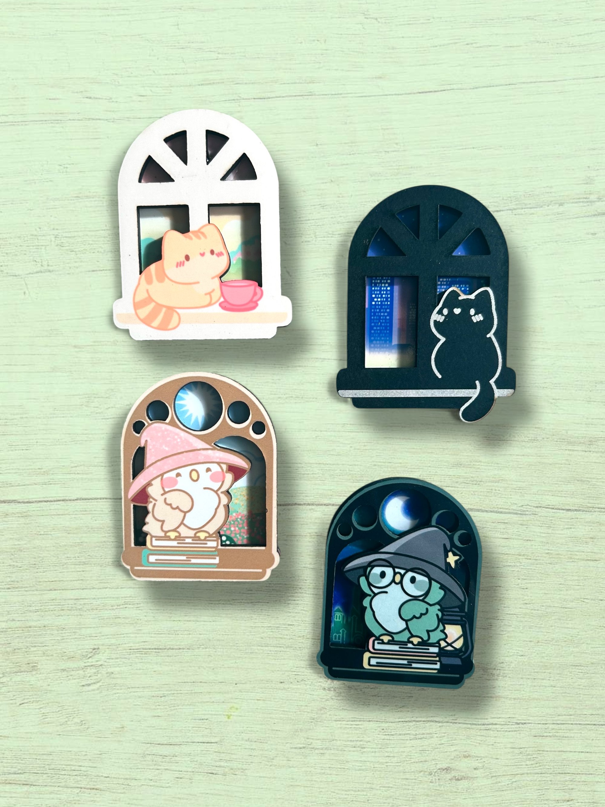 These window friends are here to remind you the outside can be a lovely place too. These designs are handmade and sublimated on laminated wood.